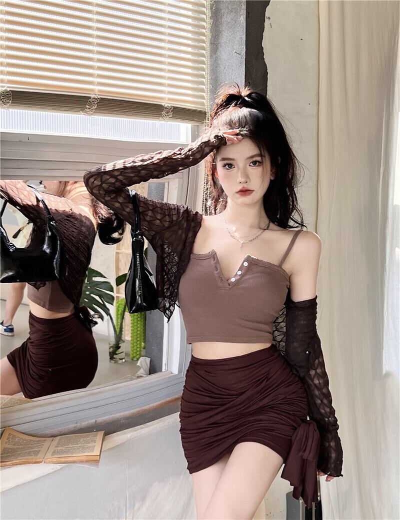 Hot button camisole women's inner wear summer 2022 new slim fit beautiful back chic short tops wear trendy ショート サマー 夏物 スリム 0921987717403080