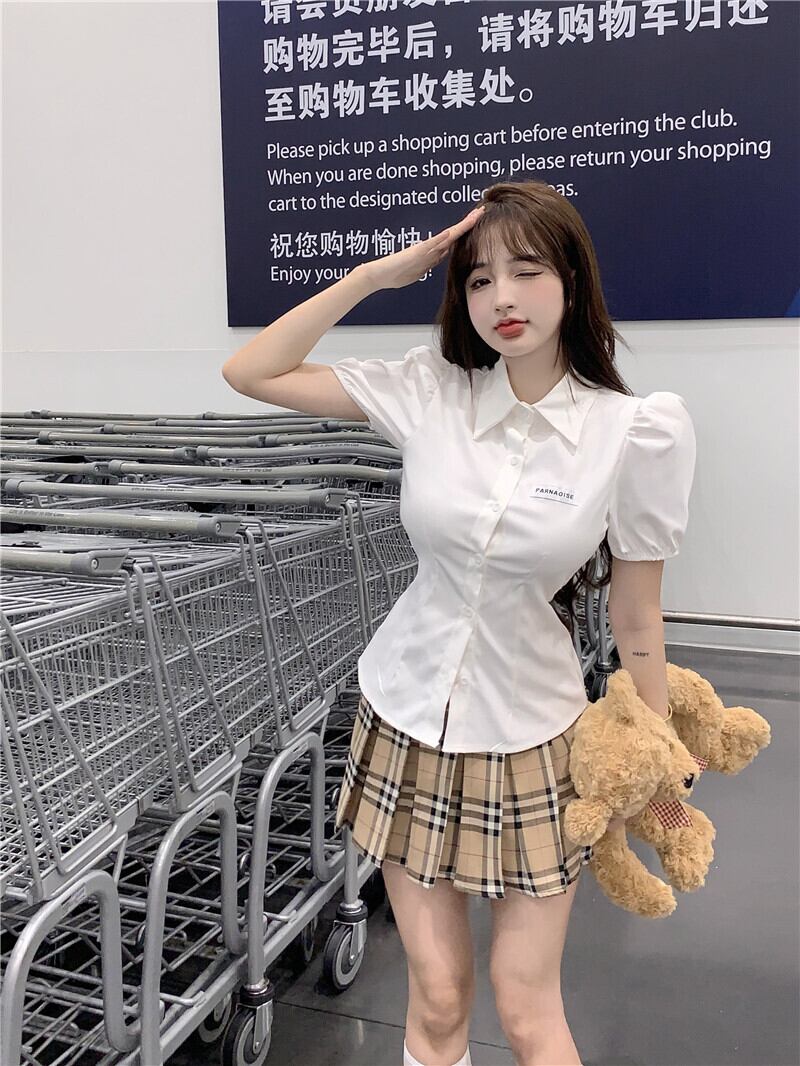 Pure desire wind pleated puff sleeves white shirt women's summer 2022 new version temperament all-match thin top trendy ホワイト プリーツ サマー 夏物 0921963503794312