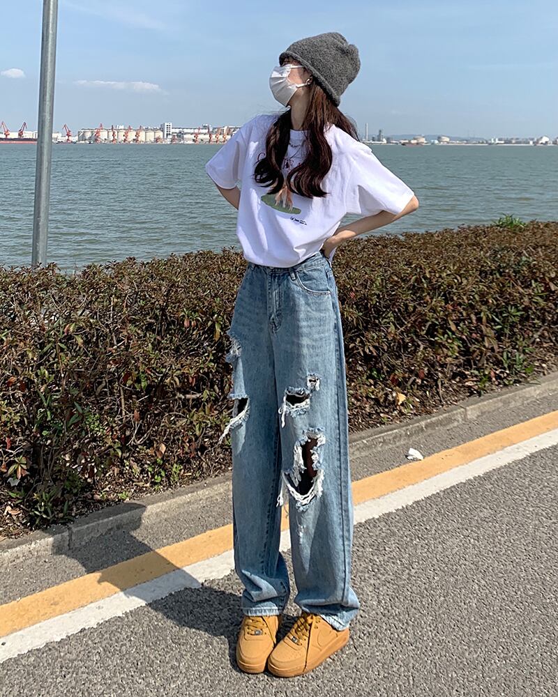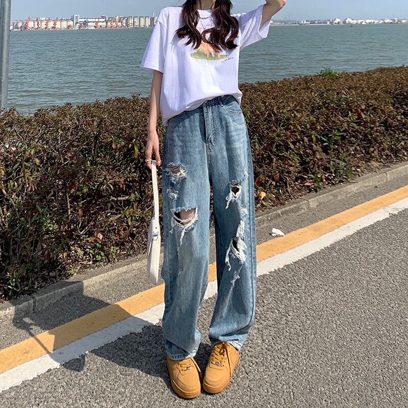 Personality beggar ripped jeans women's straight loose summer 2022 new all-match high-waisted thin wide-leg pants サマー 夏物 092197611666826
