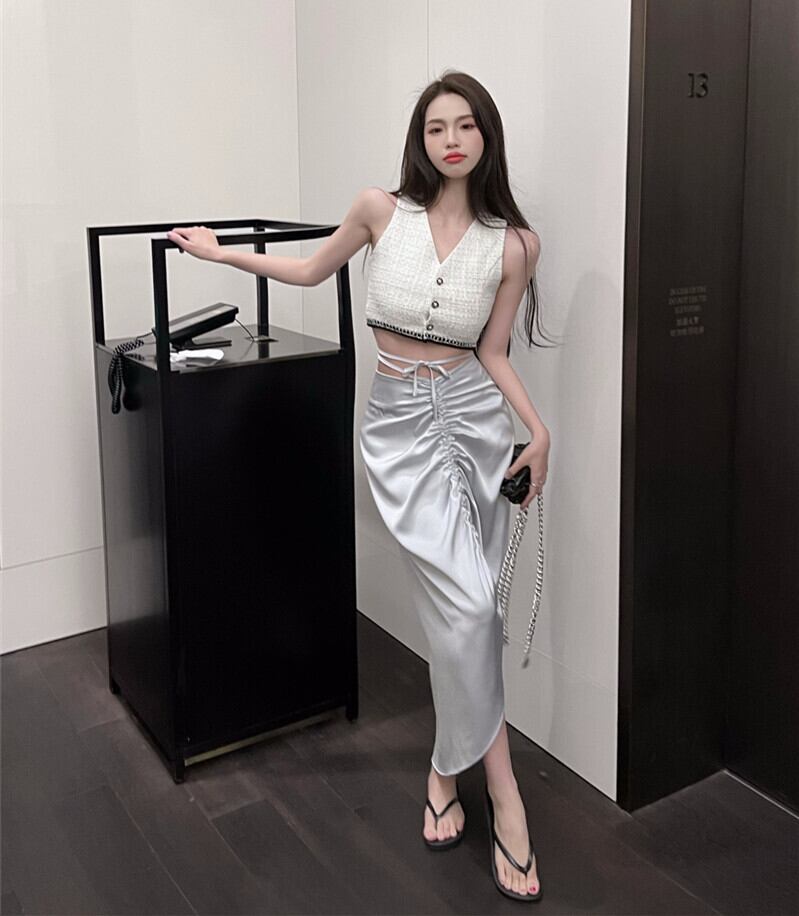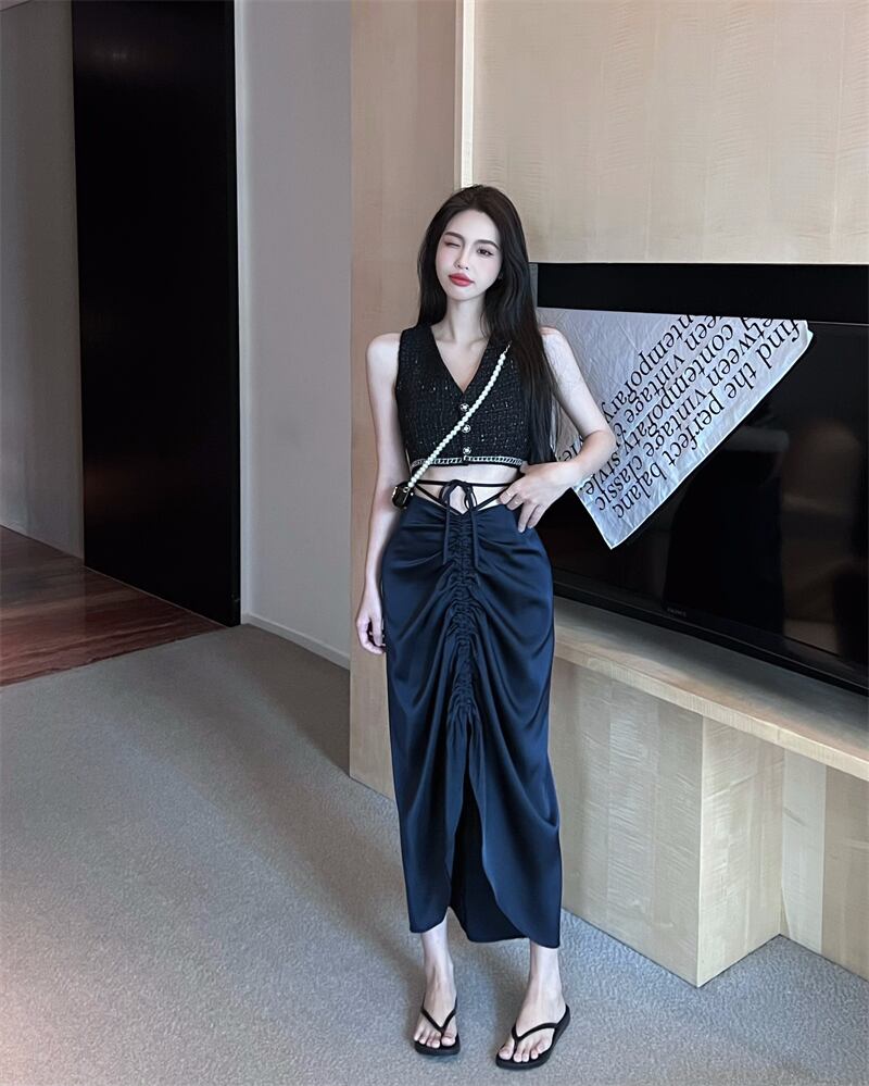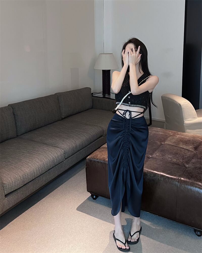 -quality satin split skirt women's summer 2022 new sexy drawstring high waist mid-length hip skirt ハイウェスト サマー 夏物 スカート サテン 0921953526099378
