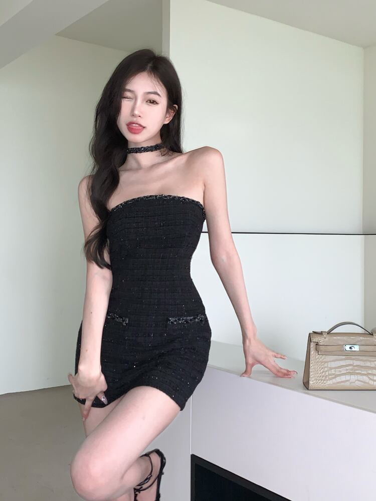 Xiaoxiangfeng temperament one-shoulder black tube top dress female summer 2022 new waist bag hip skirt ブラック サマー 夏物 スカート 0921925830781465