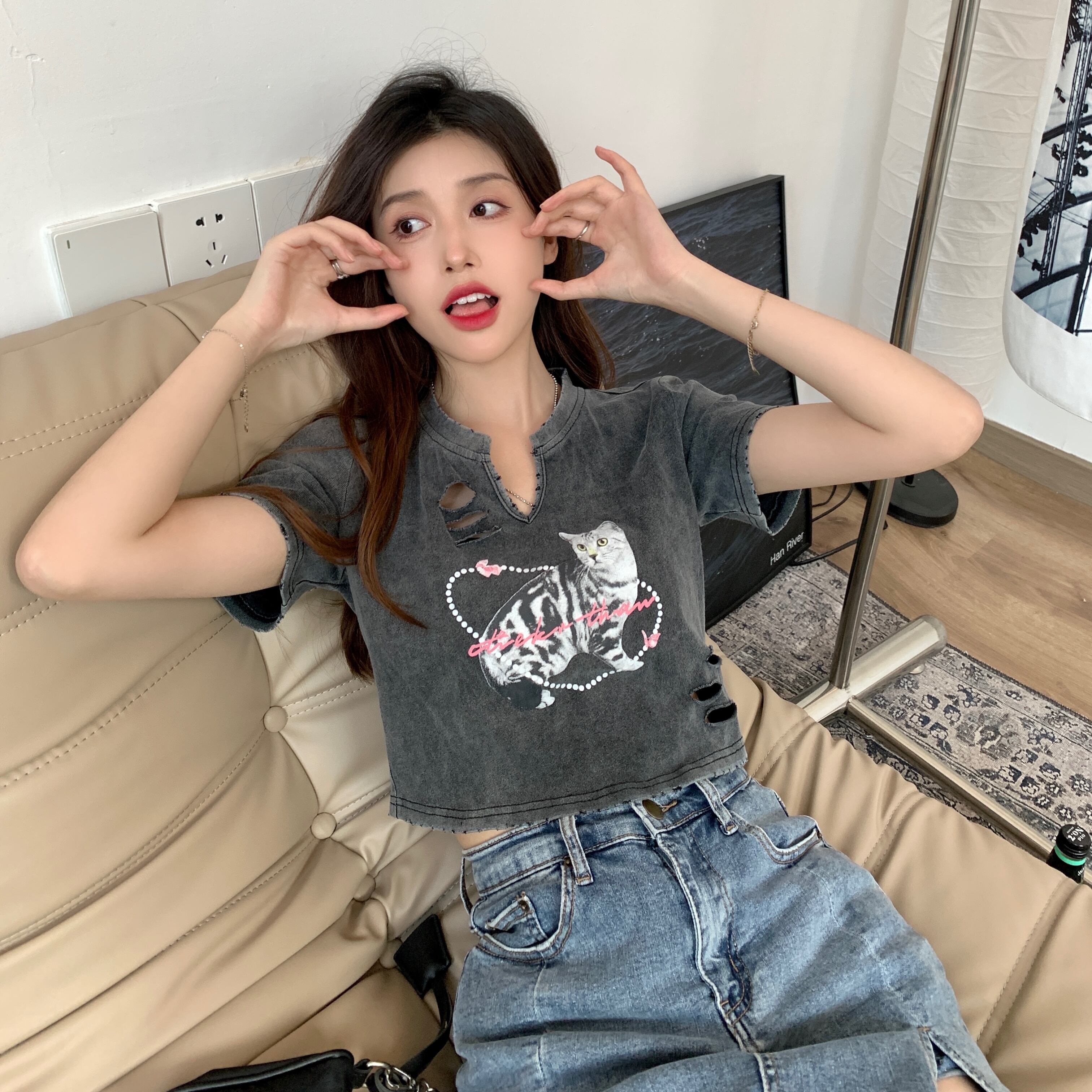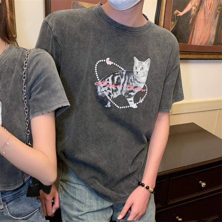 Couple wear cat short-sleeved t-shirt women's summer 2022 new style ripped half-open collar sweet and spicy style slim short top ショート 大人ガーリー スウィート キュート カジュアル サマー 夏物 スリム Tシャツ 092192549408283