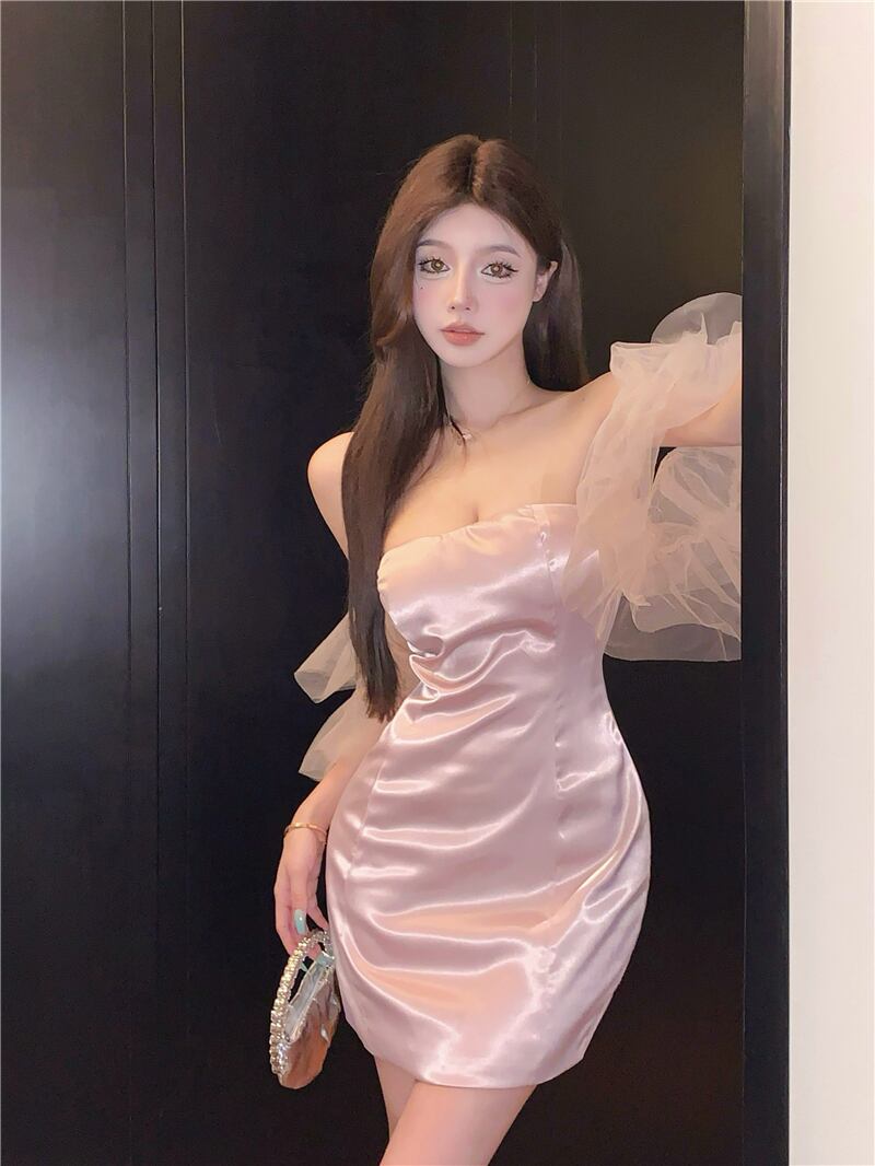Mesh satin pink one-shoulder tube top dress women's summer 2022 new high-end waist bag hip skirt ピンク サマー 夏物 メッシュ スカート サテン 0921914831458281