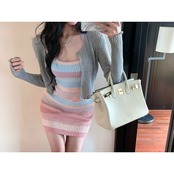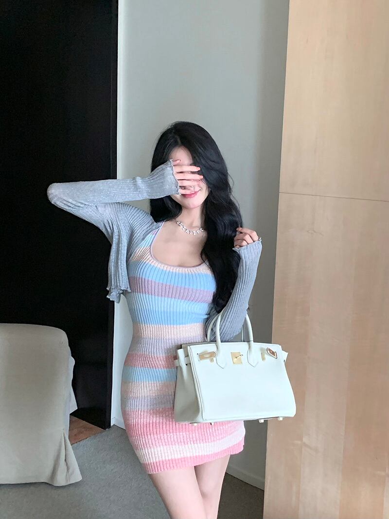 Sweet Spice Girl Rainbow Striped Knit Halter Dress Women's Summer 2022 Style Chic Waist Thin Wrap Hip Skirt 大人ガーリー スウィート キュート カジュアル サマー 夏物 スカート ストライプ 0921995242918113