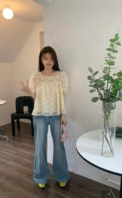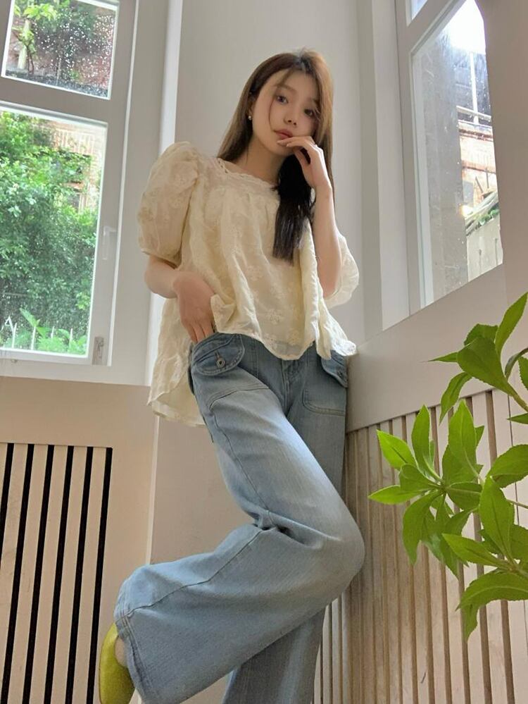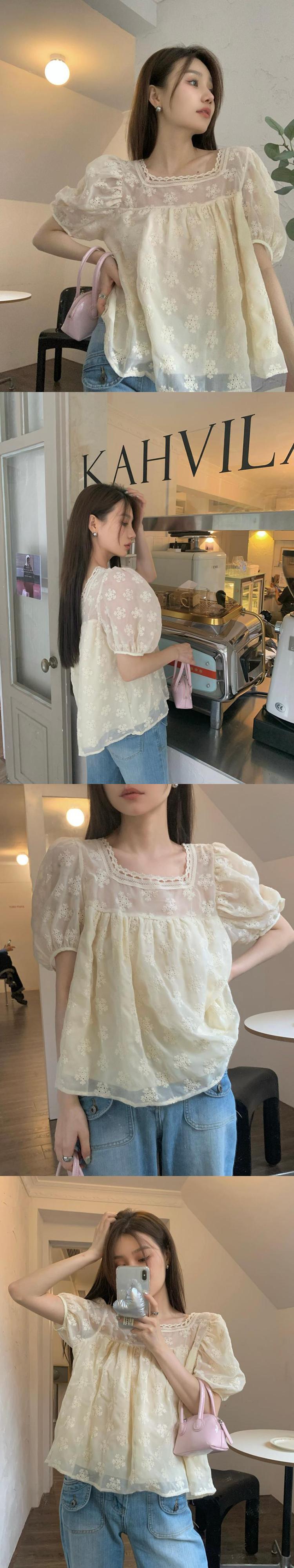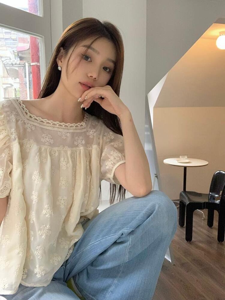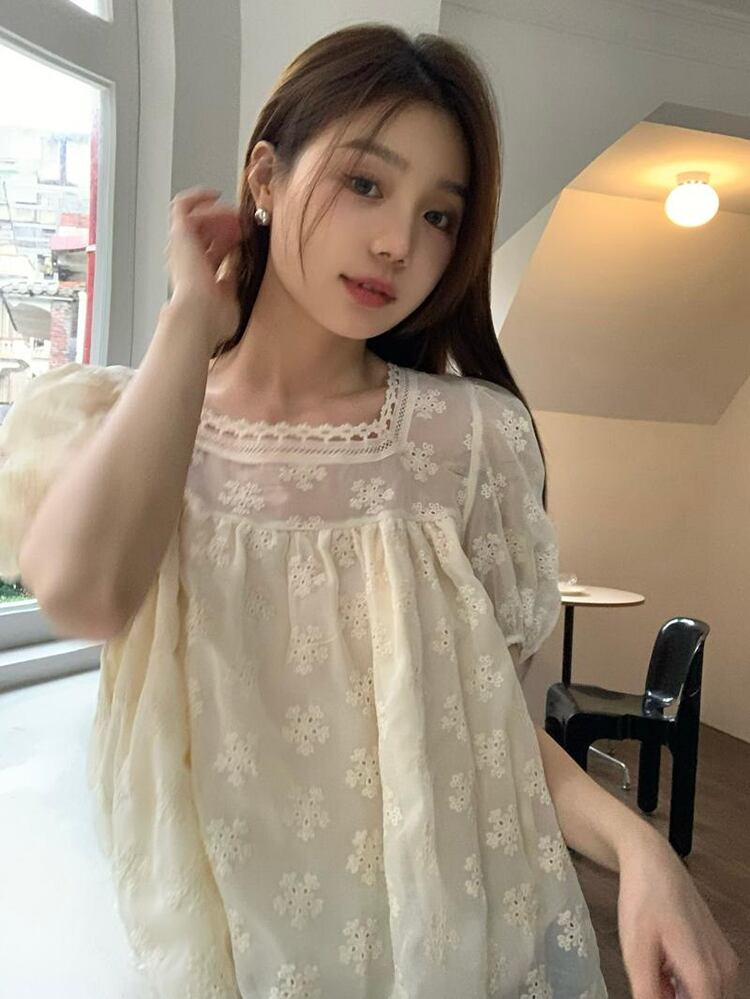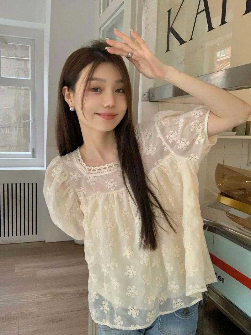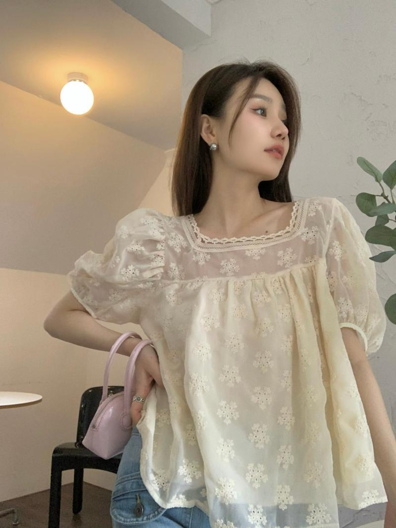 French gentle wind puff sleeve lace shirt women's summer 2022 new design sweet and thin short top ショート レース 大人ガーリー スウィート キュート カジュアル サマー 夏物 092198202928176