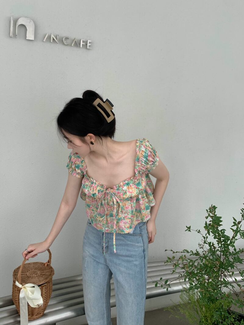 French sweet and spicy floral top women's summer 2022 new chic fungus edge slim tie short shirt tide ショート 大人ガーリー スウィート キュート カジュアル サマー 夏物 花柄 スリム 0921968323705136