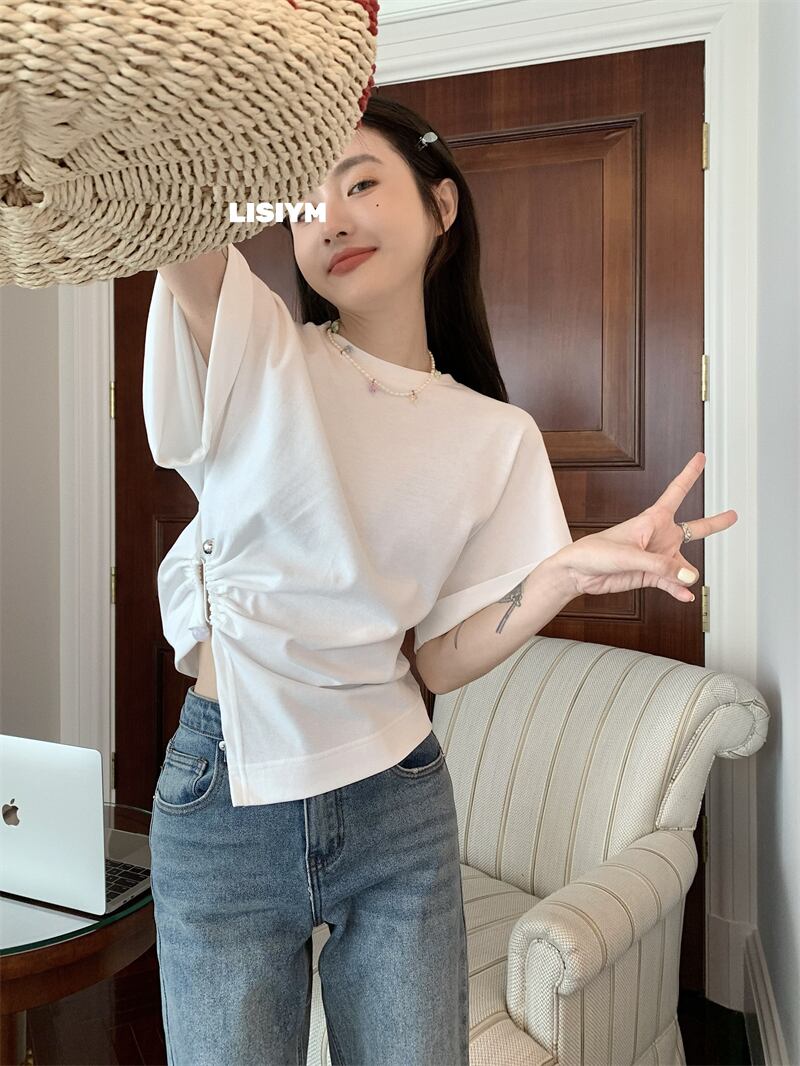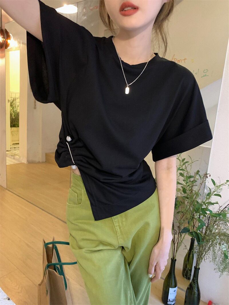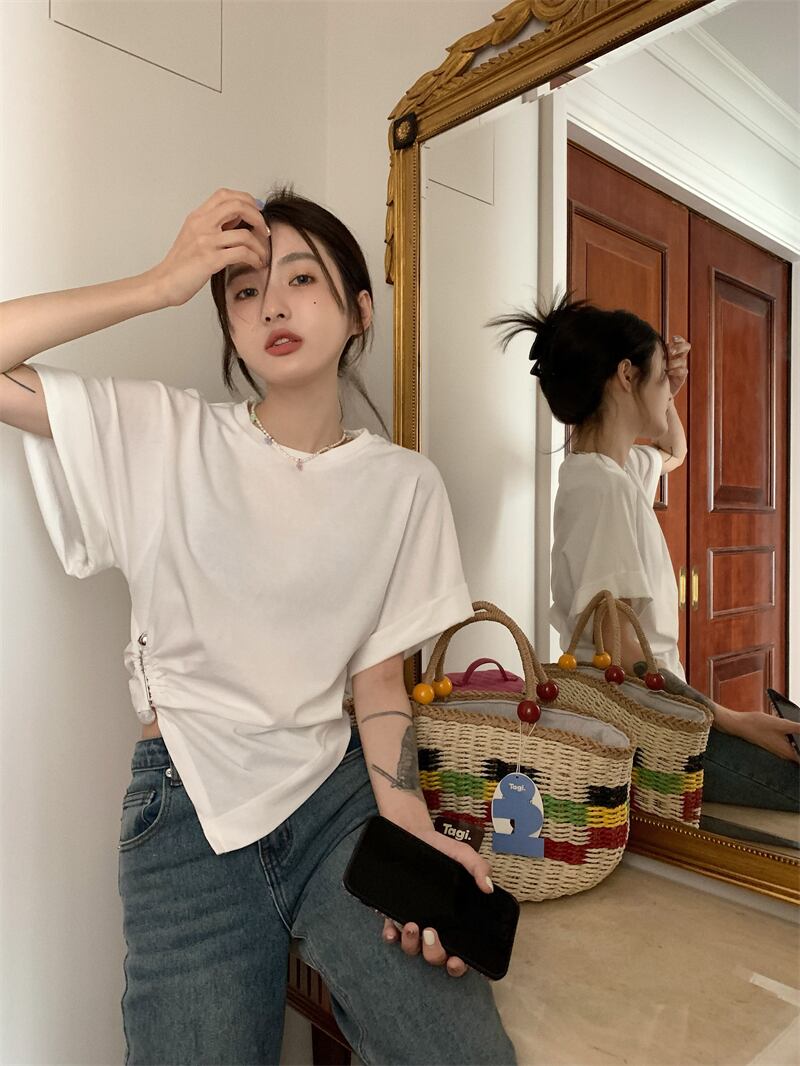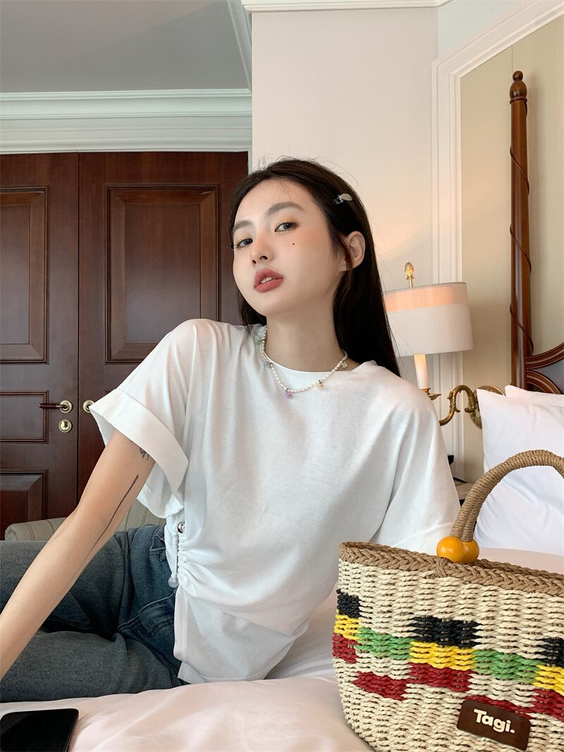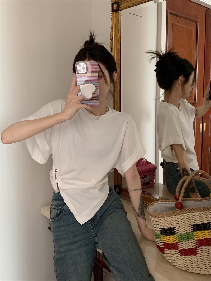sense folds irregular white short-sleeved T-shirt women's summer 2022 new version all-match loose top trendy ホワイト サマー 夏物 Tシャツ 0921978362017487