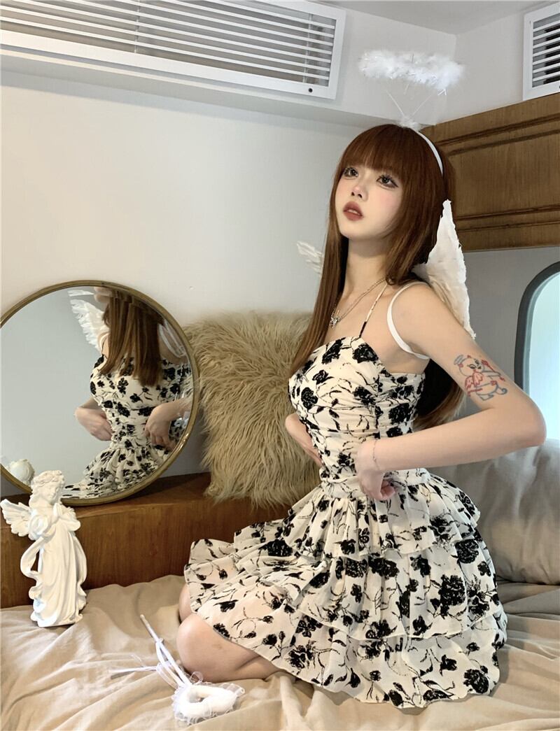 Sweet Spice Girl Floral Hanging Neck Dress Women's Summer 2022 Small Man Waist Thin Temperament Cake Skirt 大人ガーリー スウィート キュート カジュアル サマー 夏物 花柄 スカート 0921967164502407