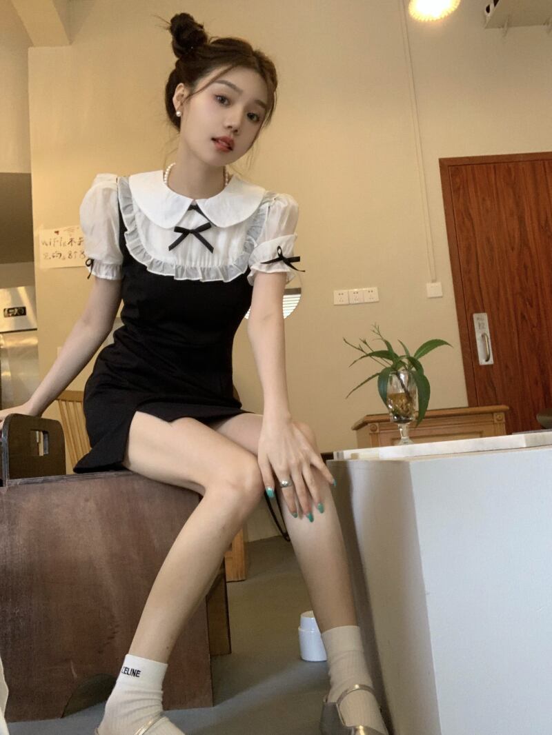 French Bow Doll Collar Puff Sleeve Dress Women's Summer 2022 Waist Slit Bag Hip Skirt Trendy リボン サマー 夏物 スカート 0921925127826949