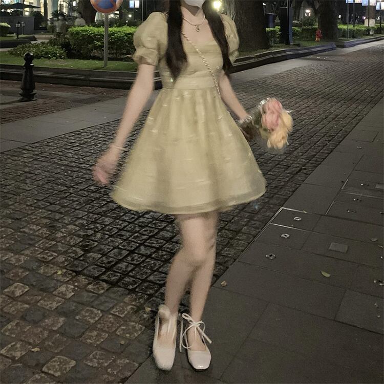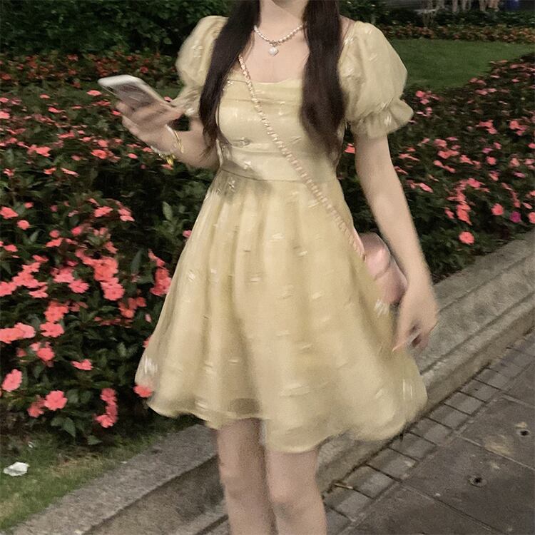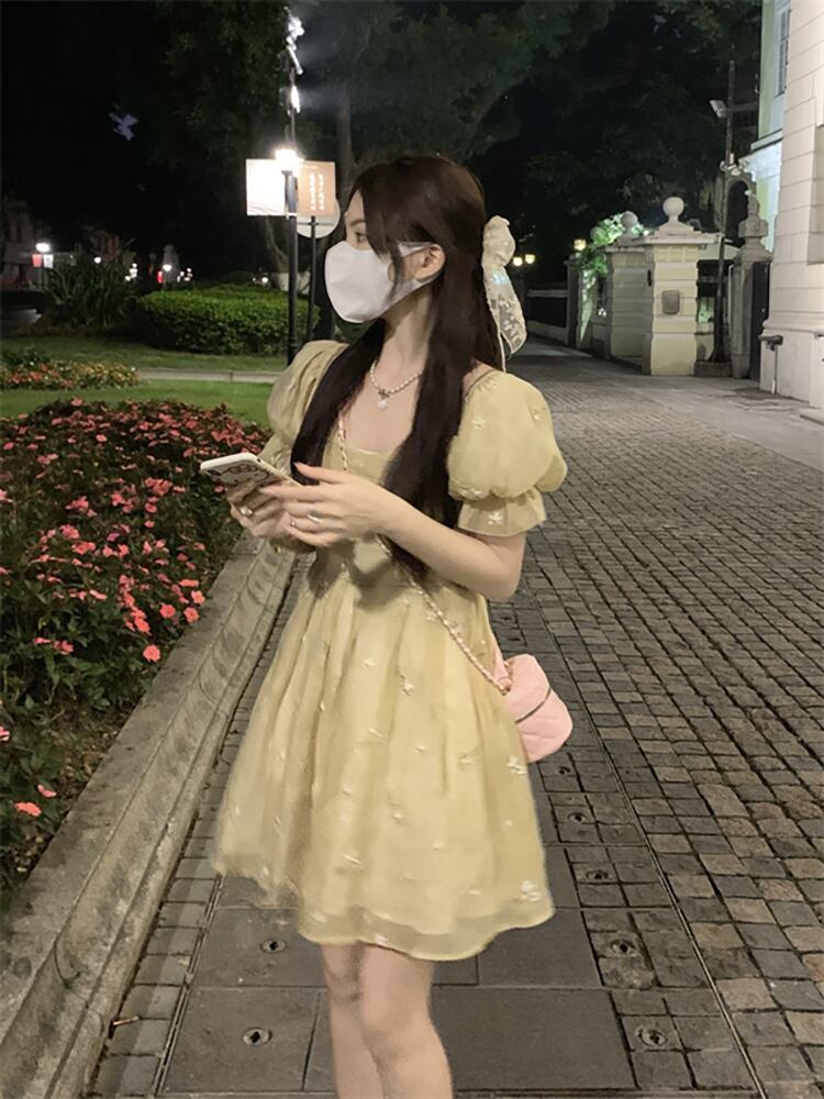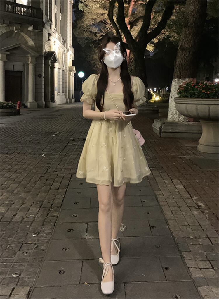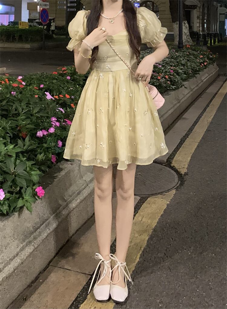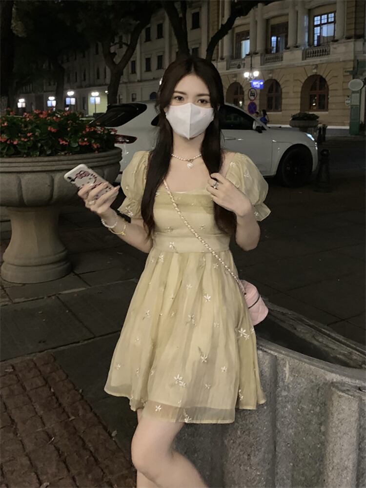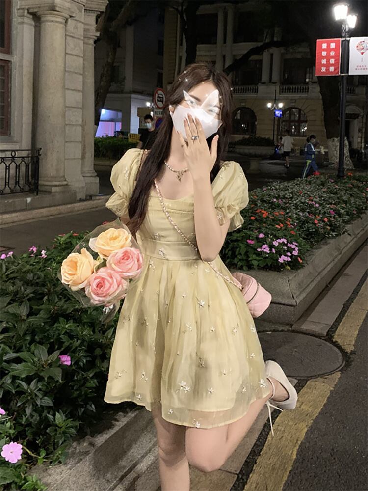 French embroidered flower puff sleeve chiffon dress women's summer 2022 new temperament waist pleated skirt tide レッド シフォン 刺繍 プリーツ サマー 夏物 スカート フラワーデザイン 0921912453332334