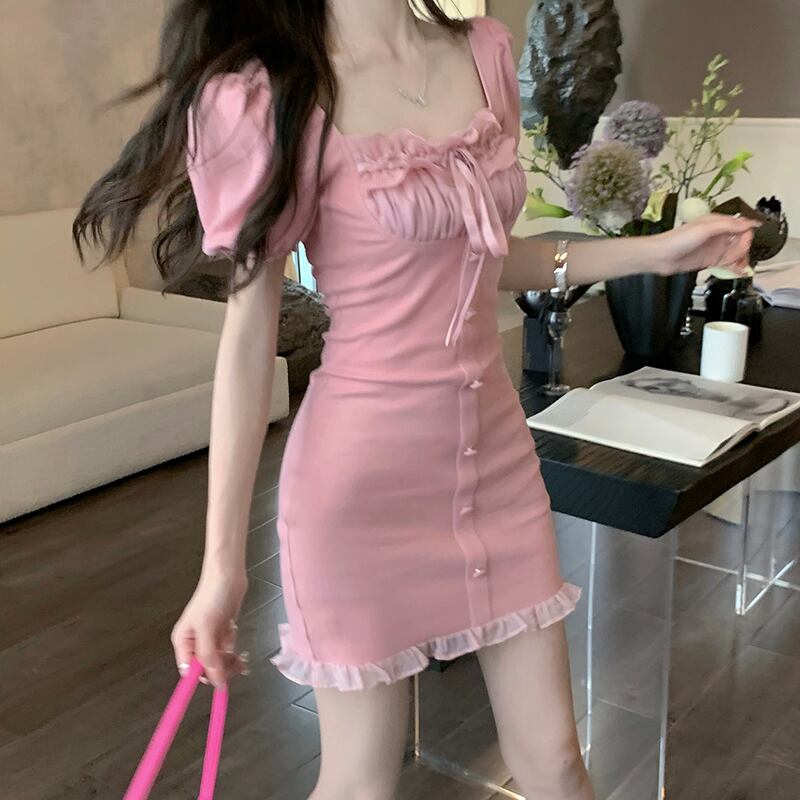 Pink stitching fungus edge puff sleeve dress women's summer 2022 new lace square collar waist bag hip skirt ピンク レース サマー 夏物 スカート スクウェア ステッチ 09219504296897