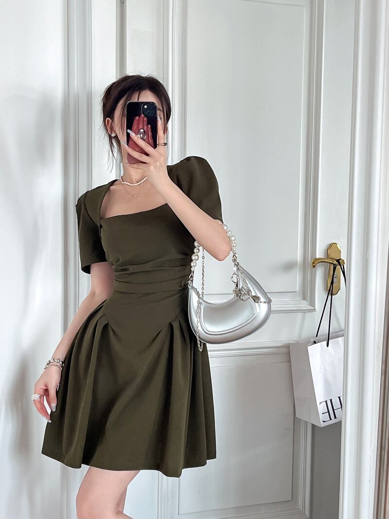 -quality retro square-neck short-sleeved dress women's summer 2022 new chic temperament waist slim pleated skirt レトロ プリーツ サマー 夏物 スカート スリム スクウェア 0921917551486534