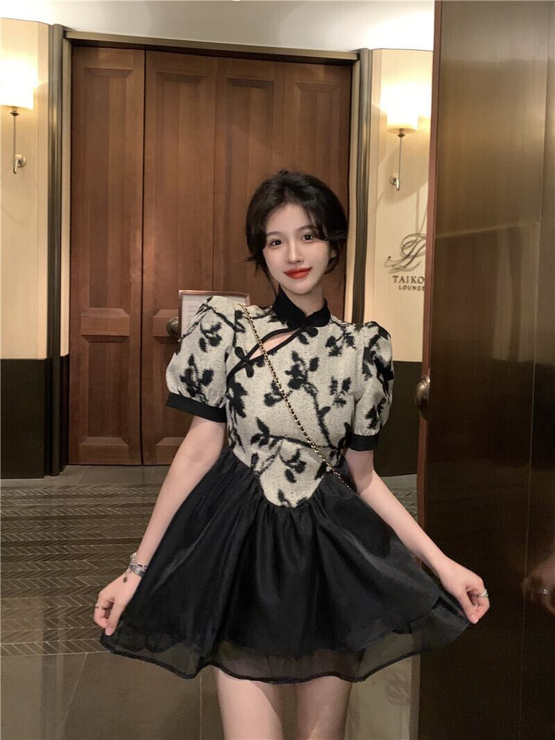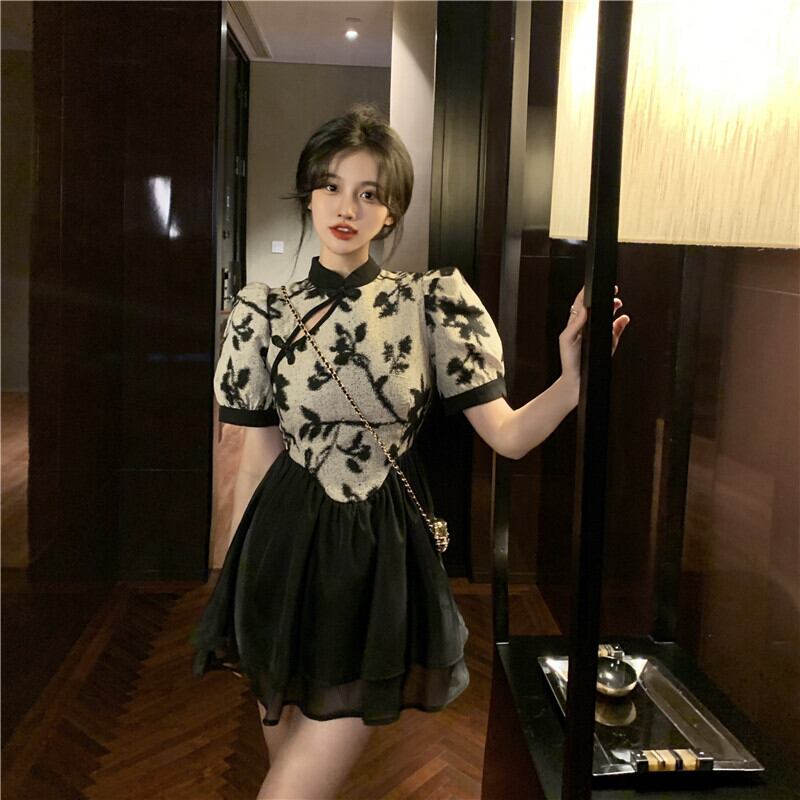 Jacquard improved cheongsam dress women's summer 2022 new stitching mesh waist waist was thin short-sleeved floral skirt サマー 夏物 メッシュ 花柄 スカート ステッチ 0921929147660234