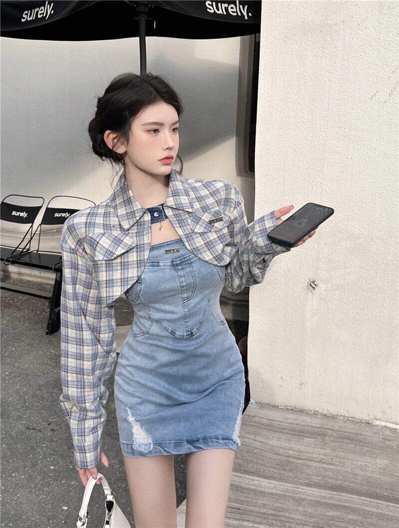 Hot chic plaid shirt women's design sense niche spring 2022 new loose outside long-sleeved short top ショート ロング スプリング 春物 0921962103763478