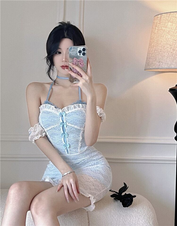 Pure desire wind lace halter dress women's summer 2022 new chic bow waist waist slim bag hip skirt リボン レース サマー 夏物 スカート スリム 0921948250440677