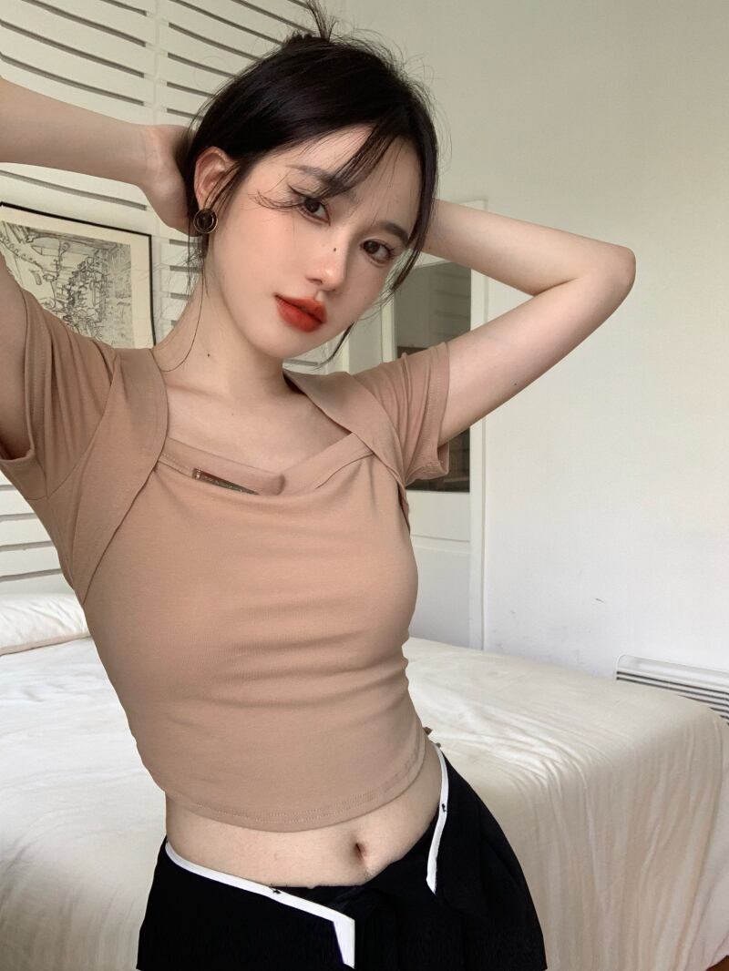 American black short-sleeved t-shirt women's summer 2022 new all-match square collar slim fit and thin short top trendy ショート ブラック サマー 夏物 スリム Tシャツ スクウェア 0921985658750862