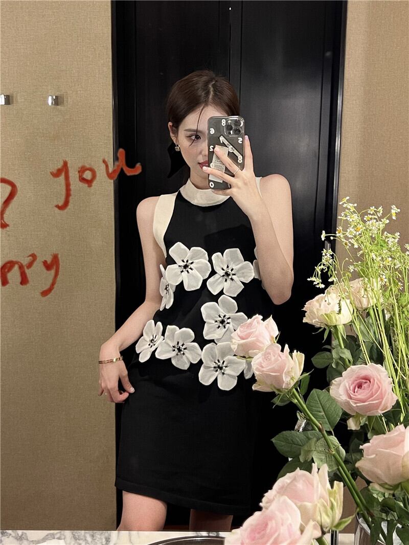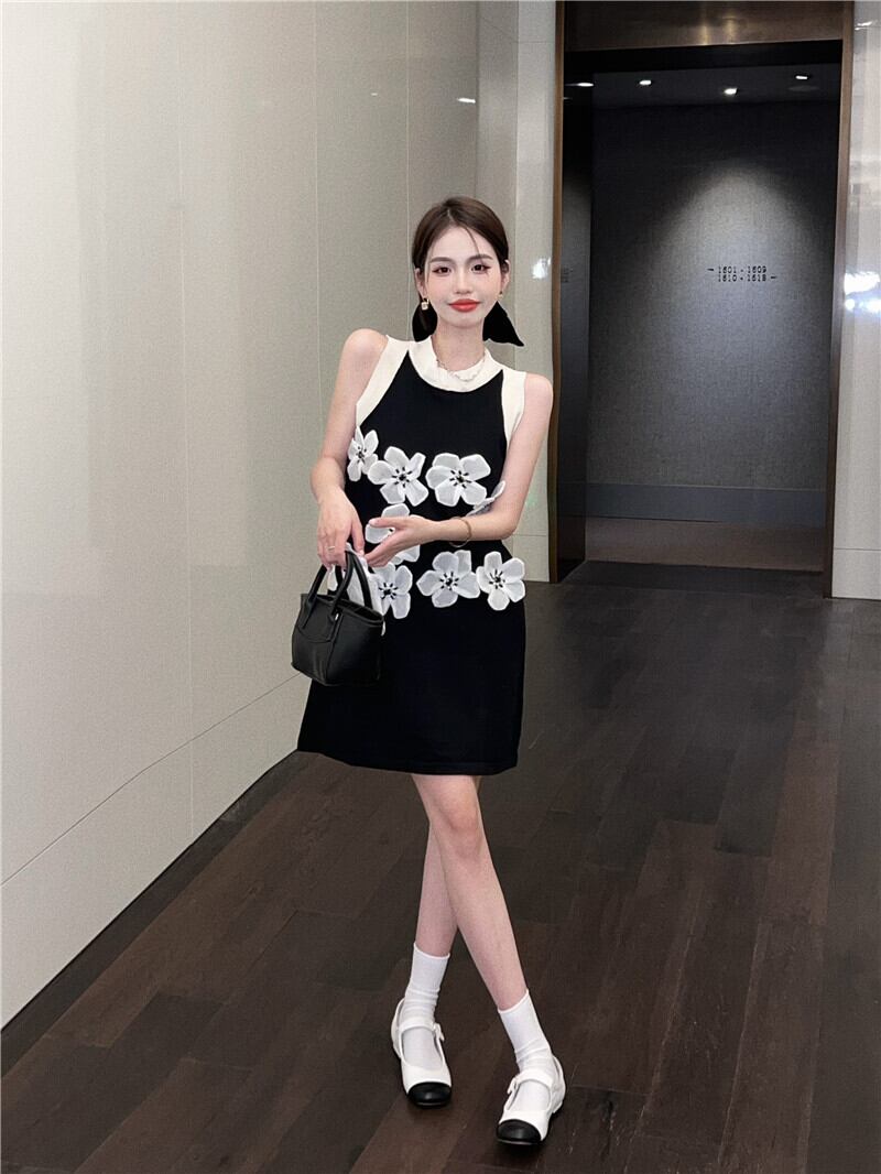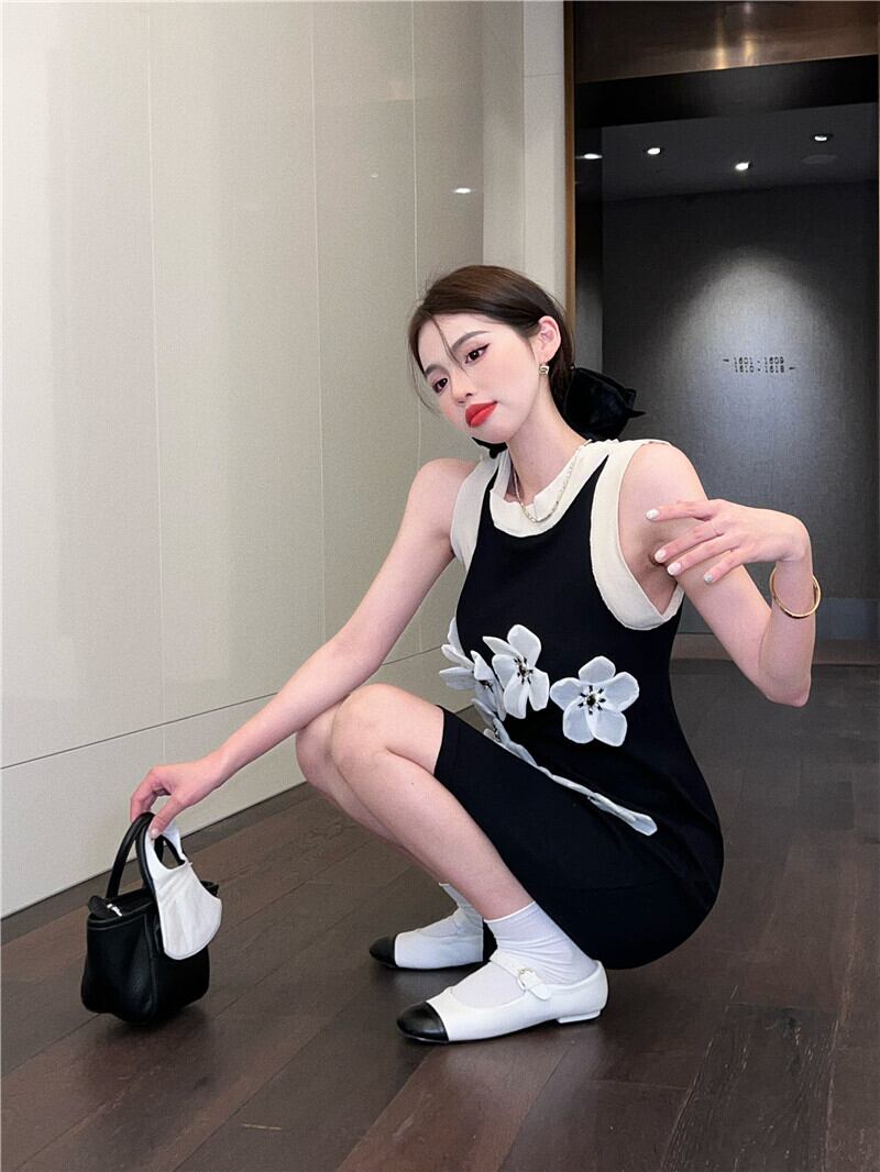 Temperament color matching flower knitted vest dress women's summer 2022 new high-end sense waist thin a-line skirt サマー 夏物 スカート Aライン フラワーデザイン 0921973925487480