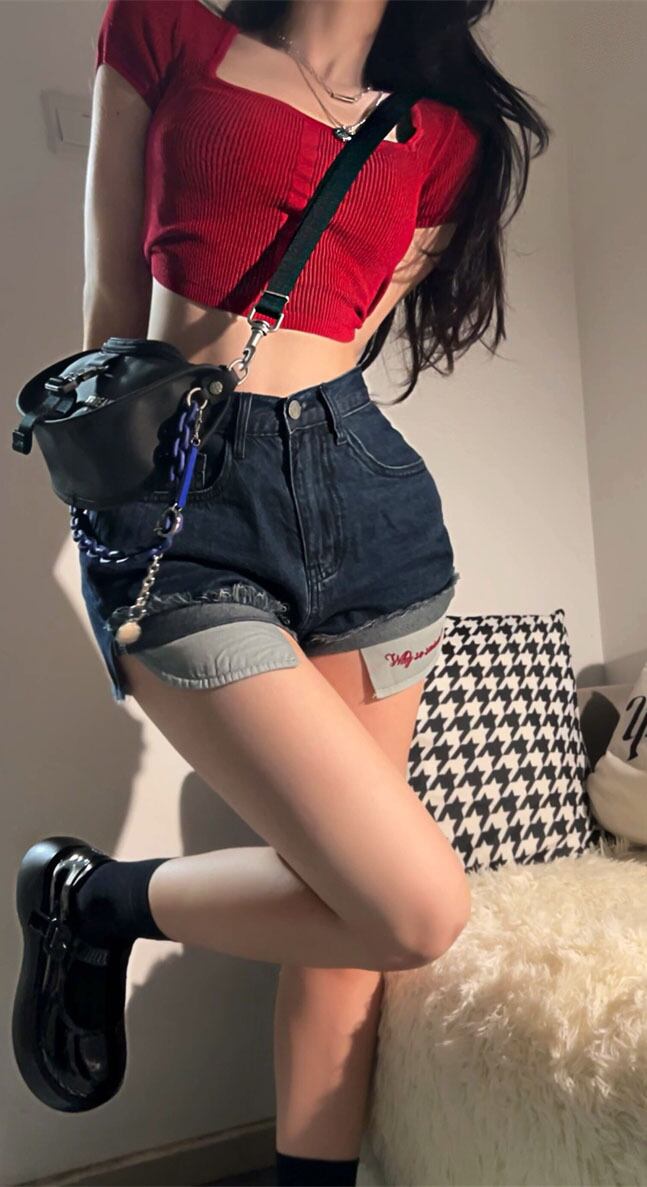 Thin knitted red front-shoulder short-sleeved t-shirt women's summer 2022 new square collar slim fit short top trendy ショート レッド サマー 夏物 スリム Tシャツ スクウェア 0921985151153867
