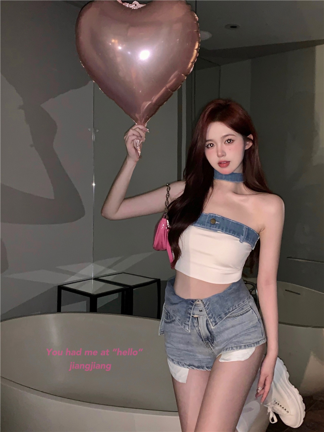 sense personality stitching denim tube top vest women wear summer 2022 new chic short top ショート サマー 夏物 ステッチ 0921933606948176