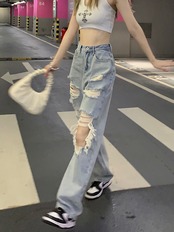 sense fashion hole washed high waist jeans women's summer 2022 new loose and thin wide leg pants ハイウェスト サマー 夏物 ワイドレッグ ワイドパンツ 092193465404065