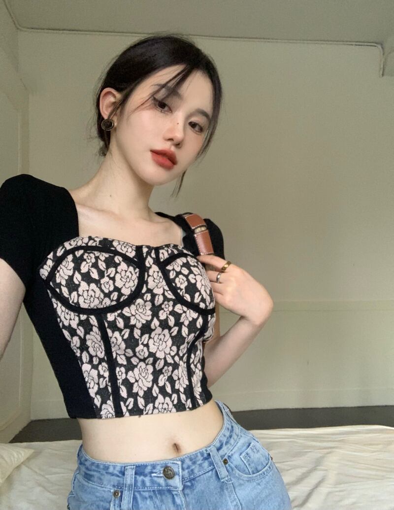 Hot retro floral stitching square collar short-sleeved T-shirt women's summer 2022 new slim chic short top trend ショート レトロ サマー 夏物 花柄 スリム Tシャツ スクウェア ステッチ 0921943577669433
