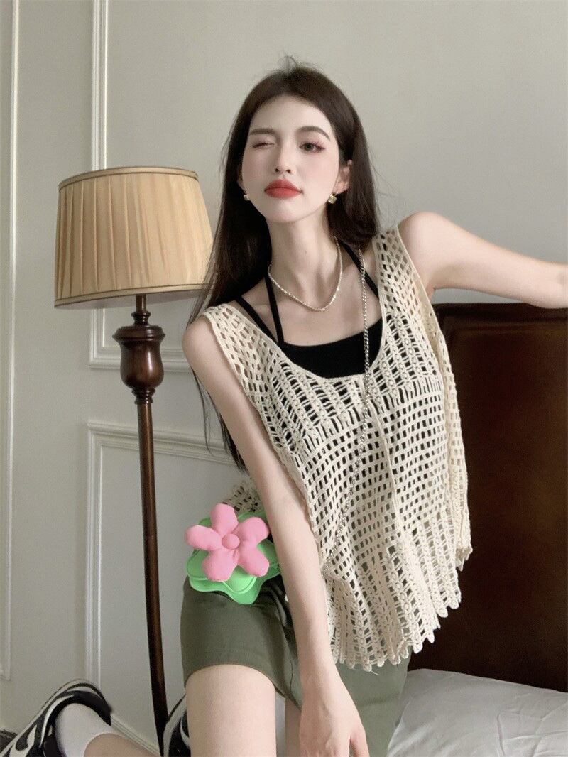 sense crocheted hollow knitted vest women's outer wear summer 2022 new net red layered loose sleeveless top レッド サマー 夏物 ノースリーブ 0921918181040522