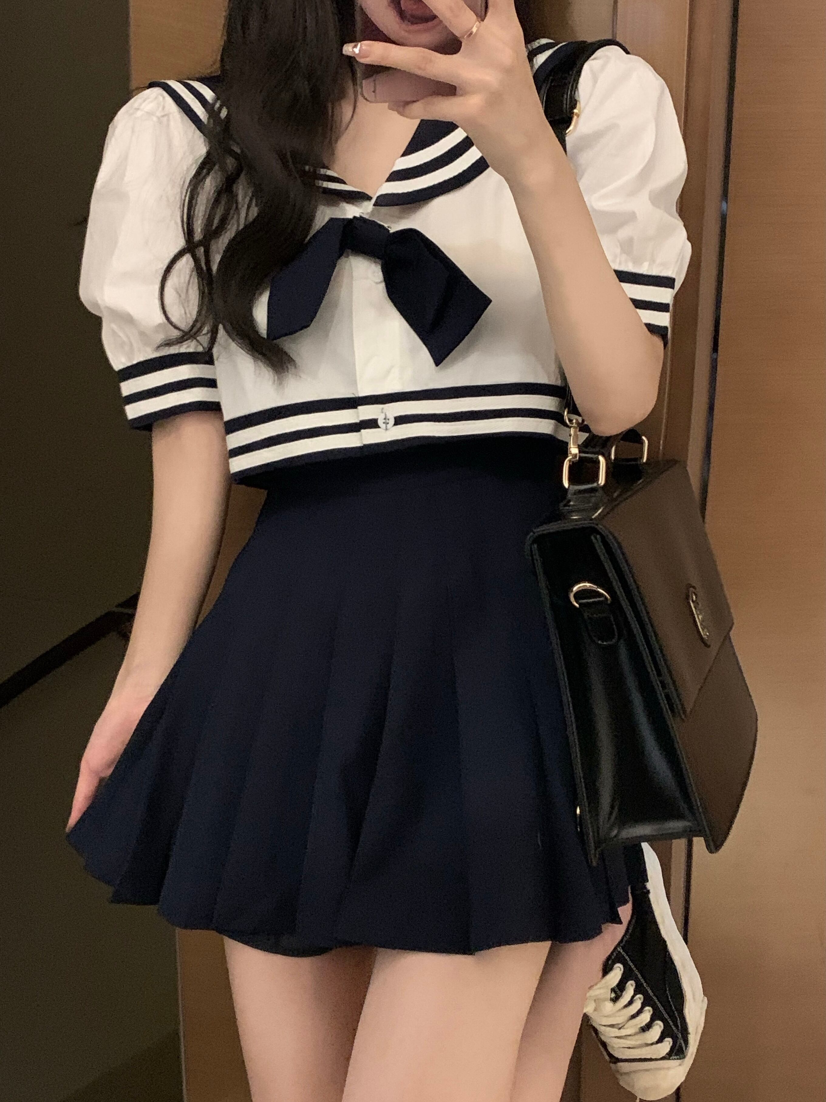 Small man hit color navy collar puff sleeves short shirt women's summer 2022 new bow tie thin shirt trend ショート リボン サマー 夏物 0921912436370699