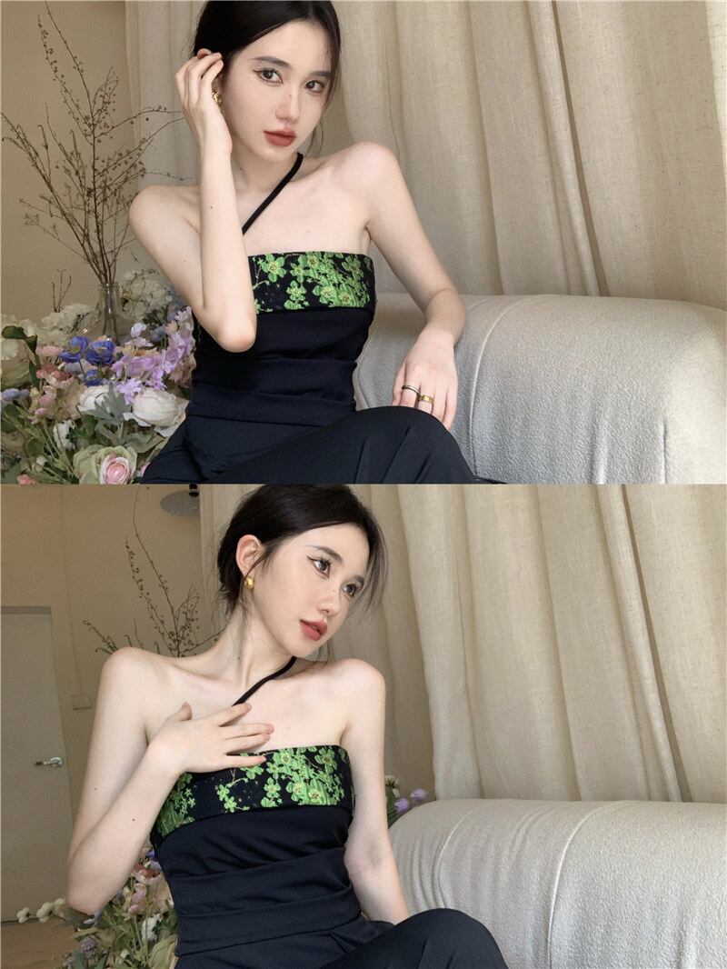 Hot new Chinese style embroidery slanted shoulder tube top vest women's inner wear summer 2022 new chic waist black top ブラック 刺繍 サマー 夏物 0921944634417969