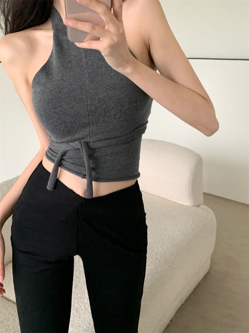 Grey knitted halterneck vest women's summer 2022 new slim fit beautiful back strappy short top wear trendy ショート サマー 夏物 スリム 0921922920340132