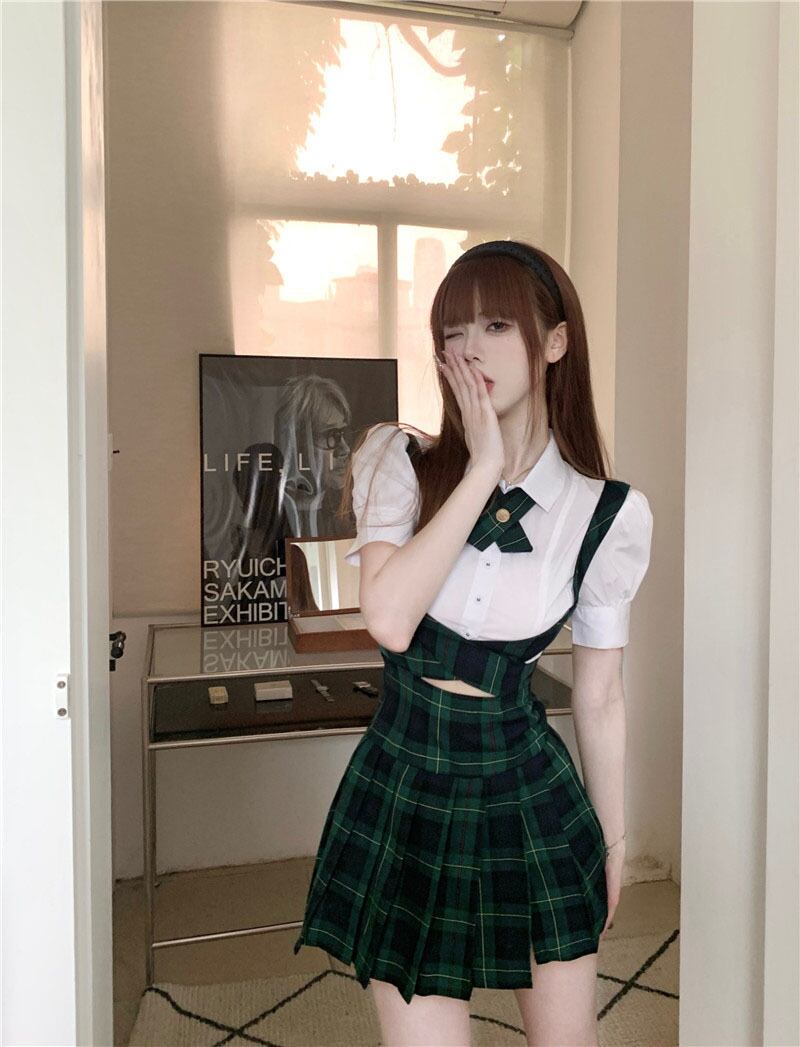 American retro plaid strap dress women's summer 2022 new cross hollow waist pleated skirt レトロ プリーツ サマー 夏物 スカート 0921913009321355