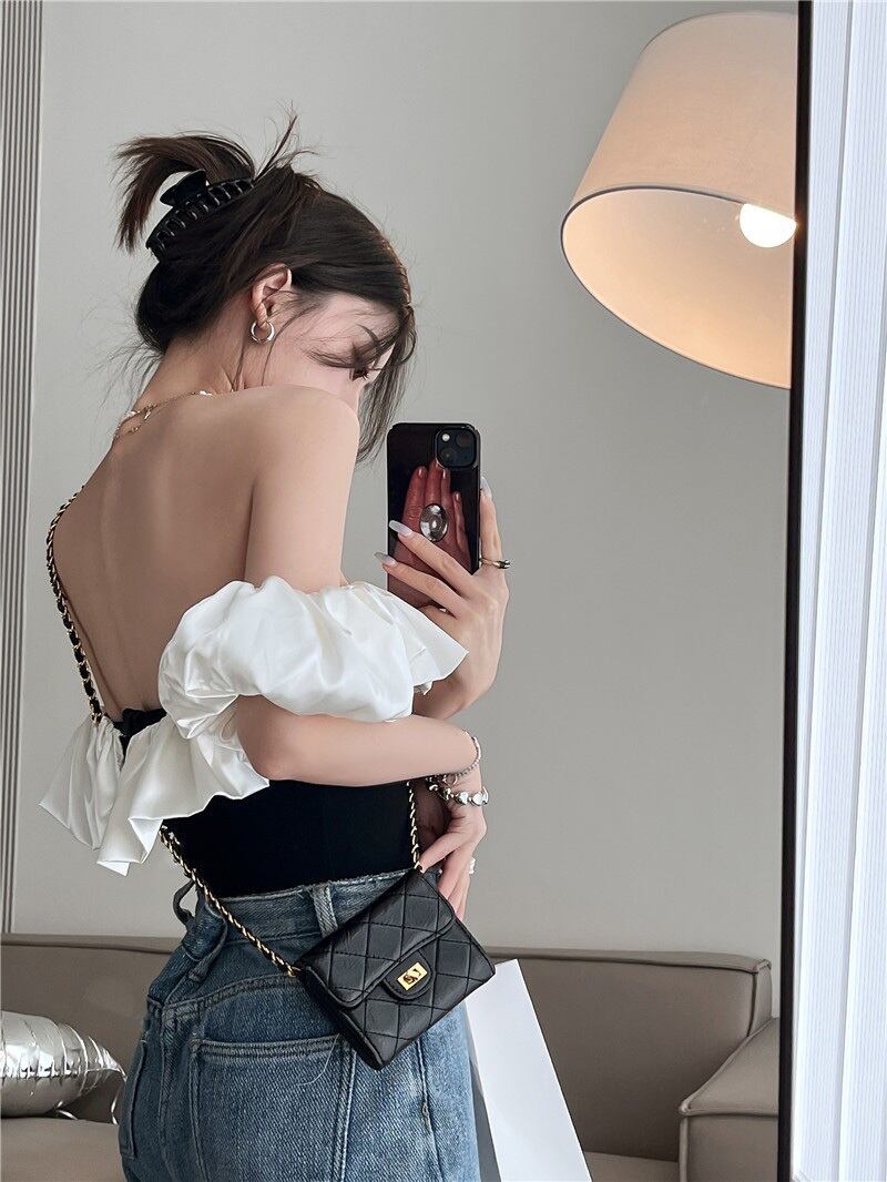 -end chic hit color ruffled puff sleeve shirt women's summer 2022 new temperament off-shoulder short top ショート サマー 夏物 オフショルダー 0921991295373179