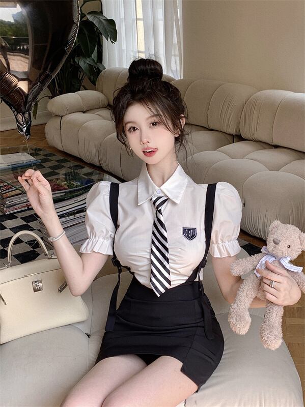 style badge puff sleeve shirt women's summer 2022 new design sense niche pleated slim-fit chic top プリーツ サマー 夏物 0921984326216265