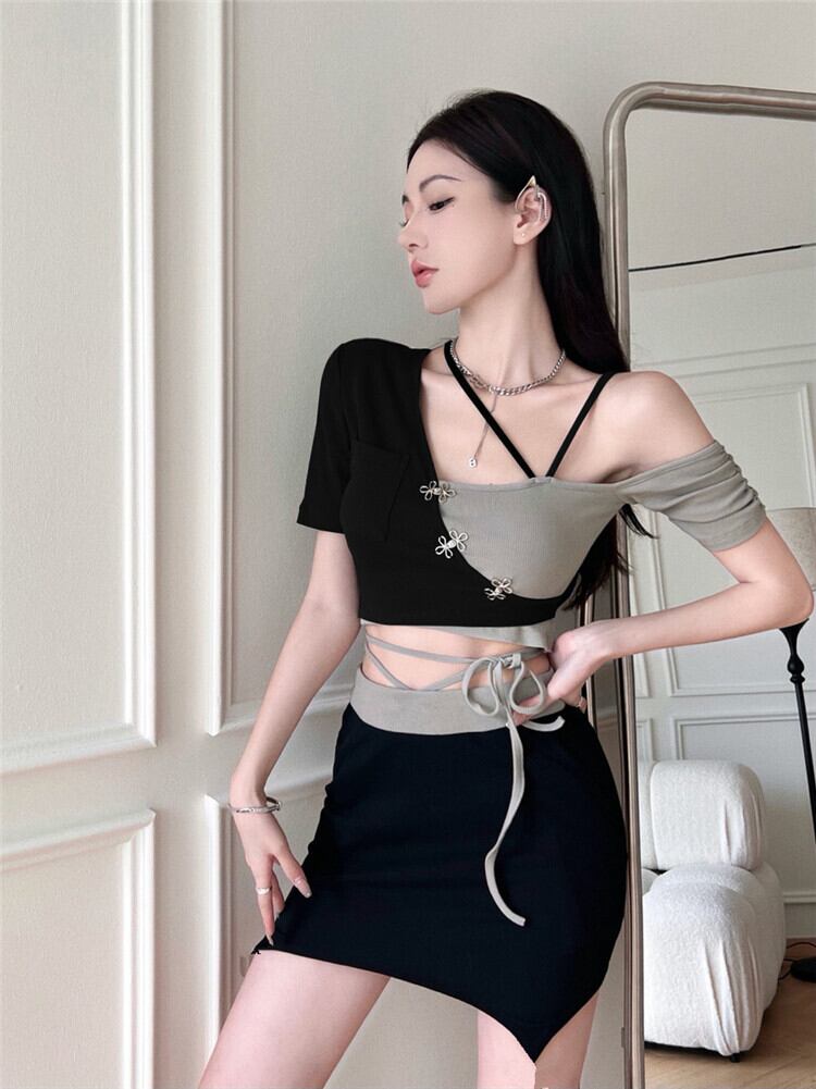 Chinese-style color-blocking halter short-sleeved t-shirt women's summer 2022 new style off-the-shoulder slim short top ショート サマー 夏物 スリム Tシャツ 0921970190168037