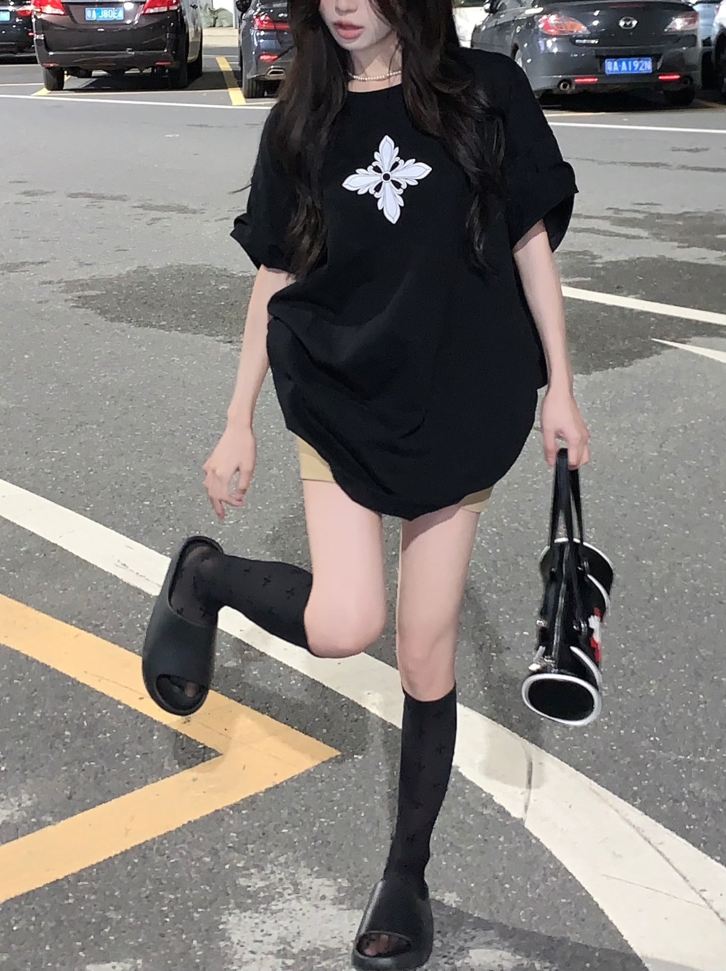 Oversize black short-sleeved t-shirt women's summer 2022 new chic print all-match loose mid-length top ブラック サマー 夏物 Tシャツ 0921927376693257