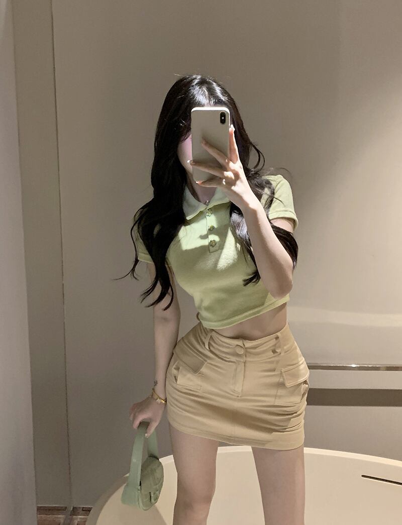 polo collar green short-sleeved t-shirt women's summer 2022 new chic sweet and spicy flower button slim short top ショート 大人ガーリー スウィート キュート カジュアル サマー 夏物 スリム Tシャツ グリーン フラワーデザイン 0921923027384154