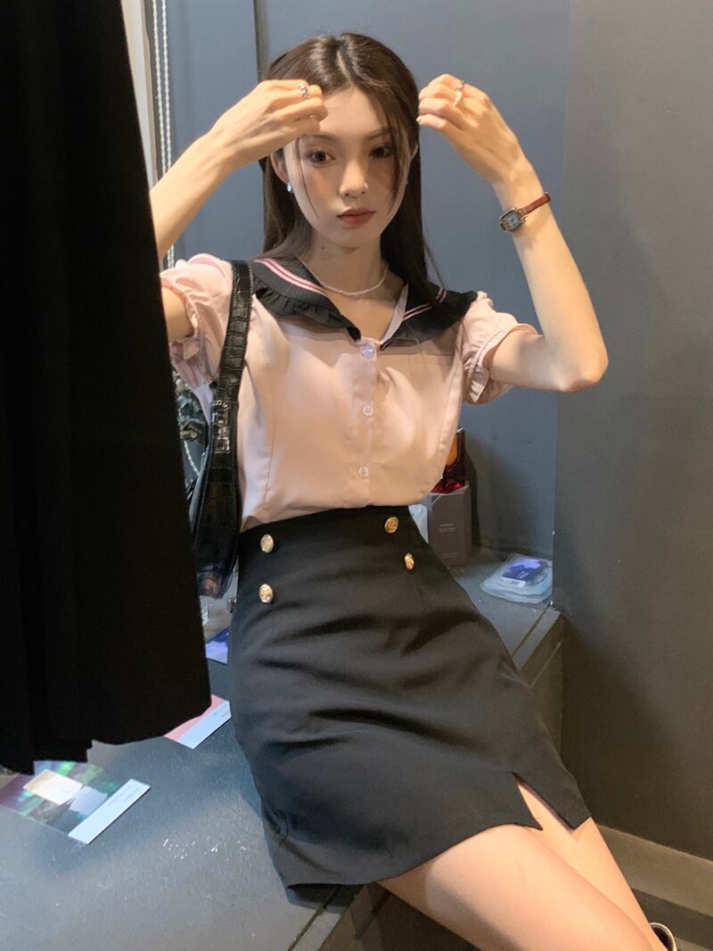 French fungus edge navy collar puff sleeve shirt women's summer 2022 new design sense niche loose shirt trend サマー 夏物 0921912423169606