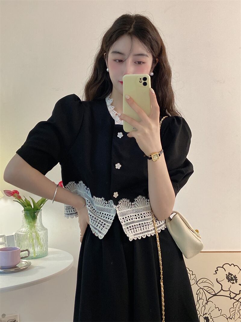French niche color contrast lace short-sleeved shirt women's summer 2022 new design sense temperament thin short top ショート レース サマー 夏物 0921939626711949