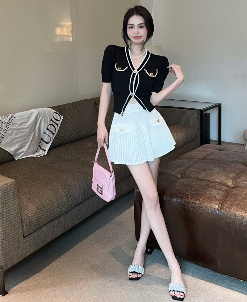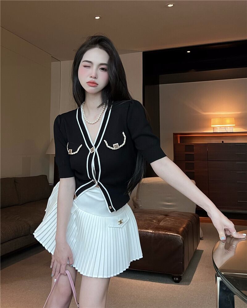 Xiaoxiangfeng contrast color V-neck short-sleeved knitted cardigan women's summer 2022 new French temperament slim short top ショート カーディガン サマー 夏物 Vネック スリム 0921982429721817