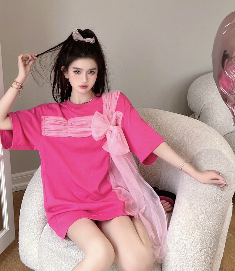 Sweet three-dimensional mesh bow short-sleeved t-shirt women's summer 2022 new design loose mid-length top リボン 大人ガーリー スウィート キュート カジュアル サマー 夏物 メッシュ Tシャツ 0921926422447457