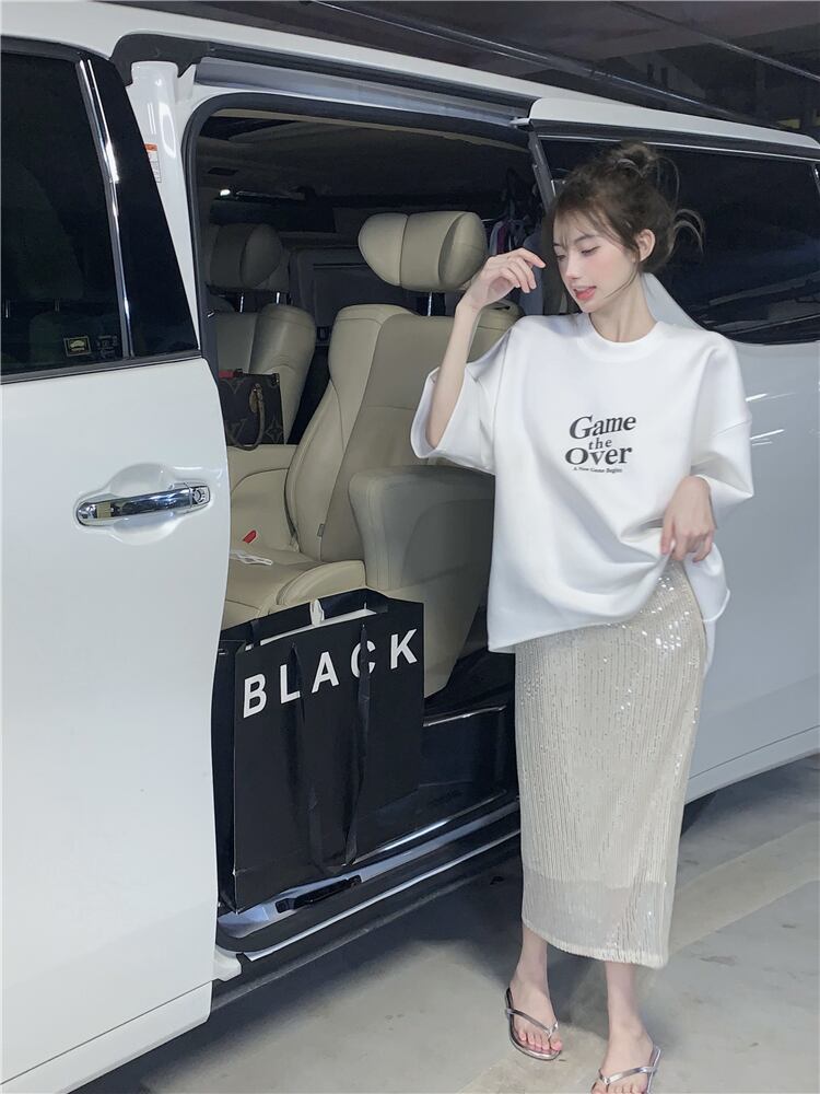 sense fashion letters white half-sleeved T-shirt women's summer 2022 new version loose mid-length top trendy ホワイト サマー 夏物 Tシャツ 0921910852348326