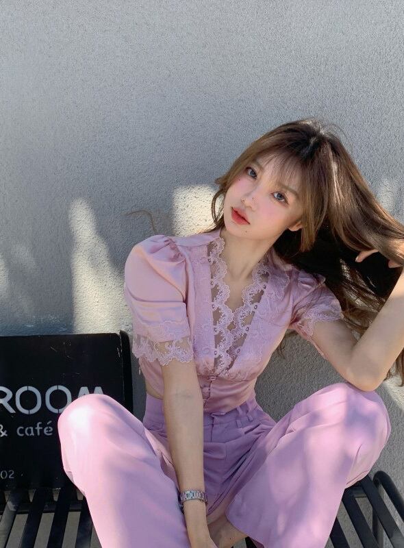 French chic lace stitching V-neck short-sleeved shirt women's summer 2022 new temperament thin short top ins ショート レース サマー 夏物 Vネック ステッチ 0921915946081369
