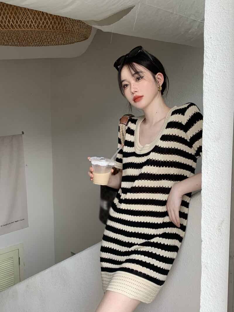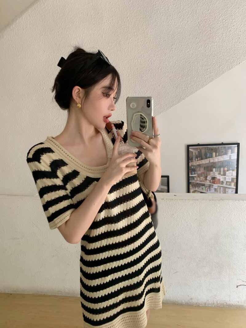 Retro striped short-sleeved knitted dress women's summer 2022 new version of the lazy style loose and thin A-line skirt レトロ サマー 夏物 スカート Aライン ストライプ 0921990773987273