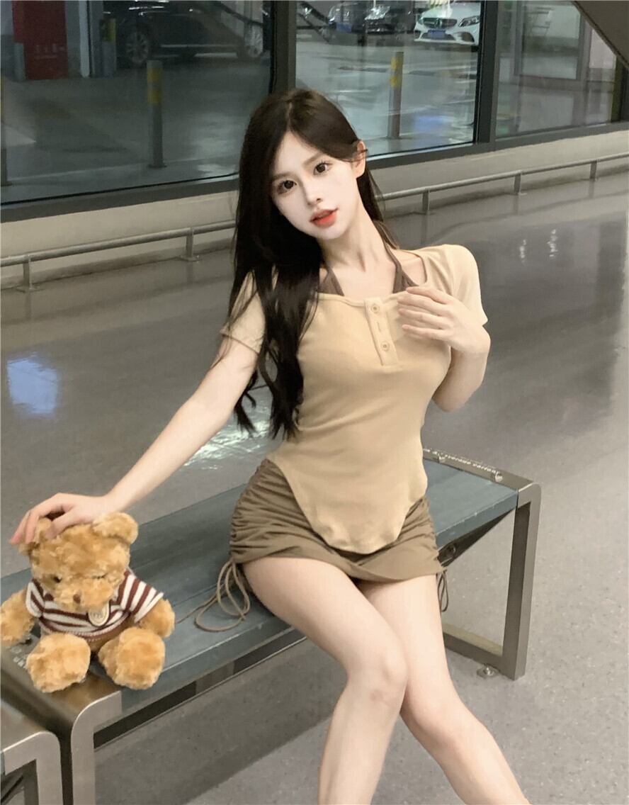 Chic hit color hanging neck short-sleeved t-shirt female ins tide summer 2022 new net red irregular self-cultivation pure desire top レッド サマー 夏物 Tシャツ ピュア 0921976383521037
