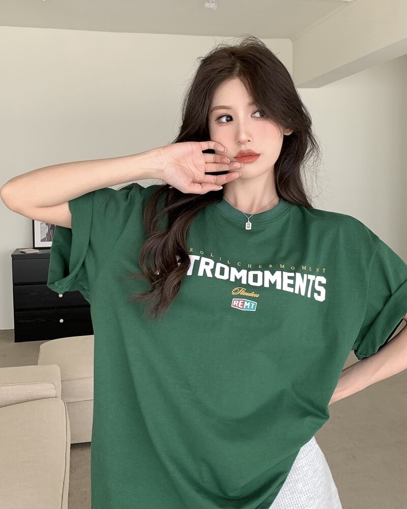 Retro green short-sleeved t-shirt women's ins tide summer 2022 new letter printing casual loose mid-length top レトロ カジュアル サマー 夏物 Tシャツ グリーン 0921974993953440