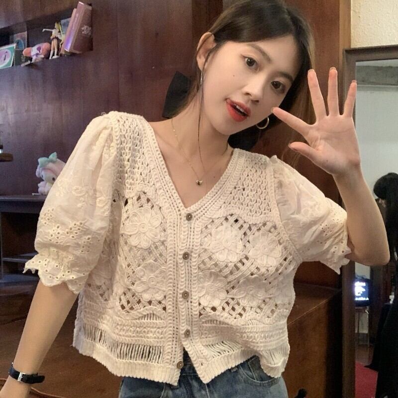 Gentle wind temperament hollow jacquard V-neck knitted cardigan women's summer 2022 new version thin short top ショート カーディガン サマー 夏物 Vネック 0921929108110803
