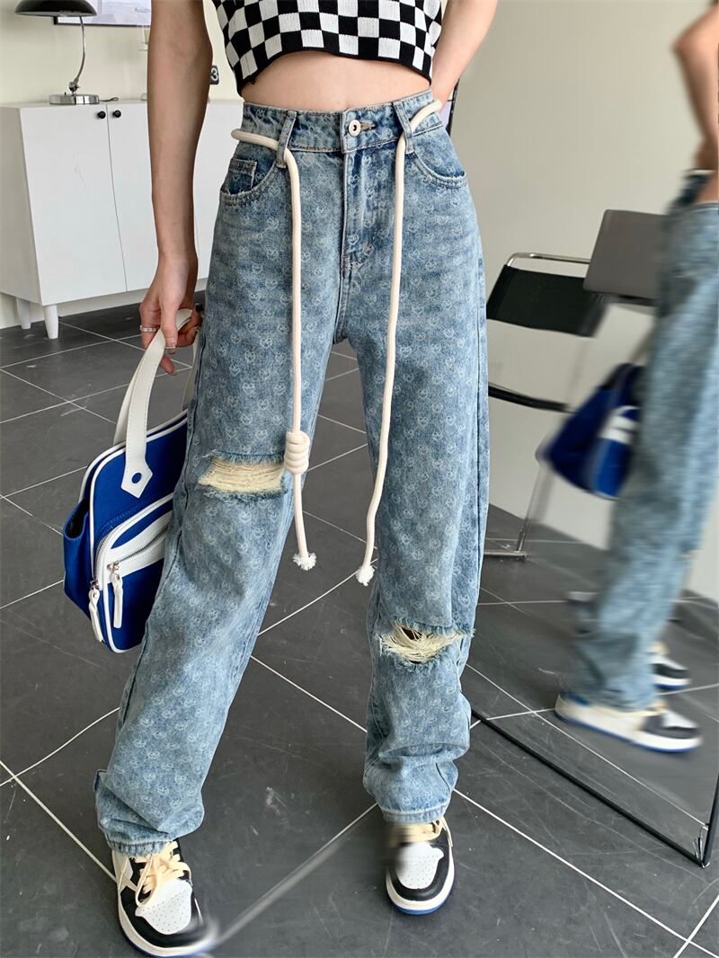 Retro jacquard ripped jeans women's summer 2022 new design high waist slim straight loose wide leg pants ハイウェスト レトロ サマー 夏物 スリム ワイドレッグ ワイドパンツ 0921999418570877