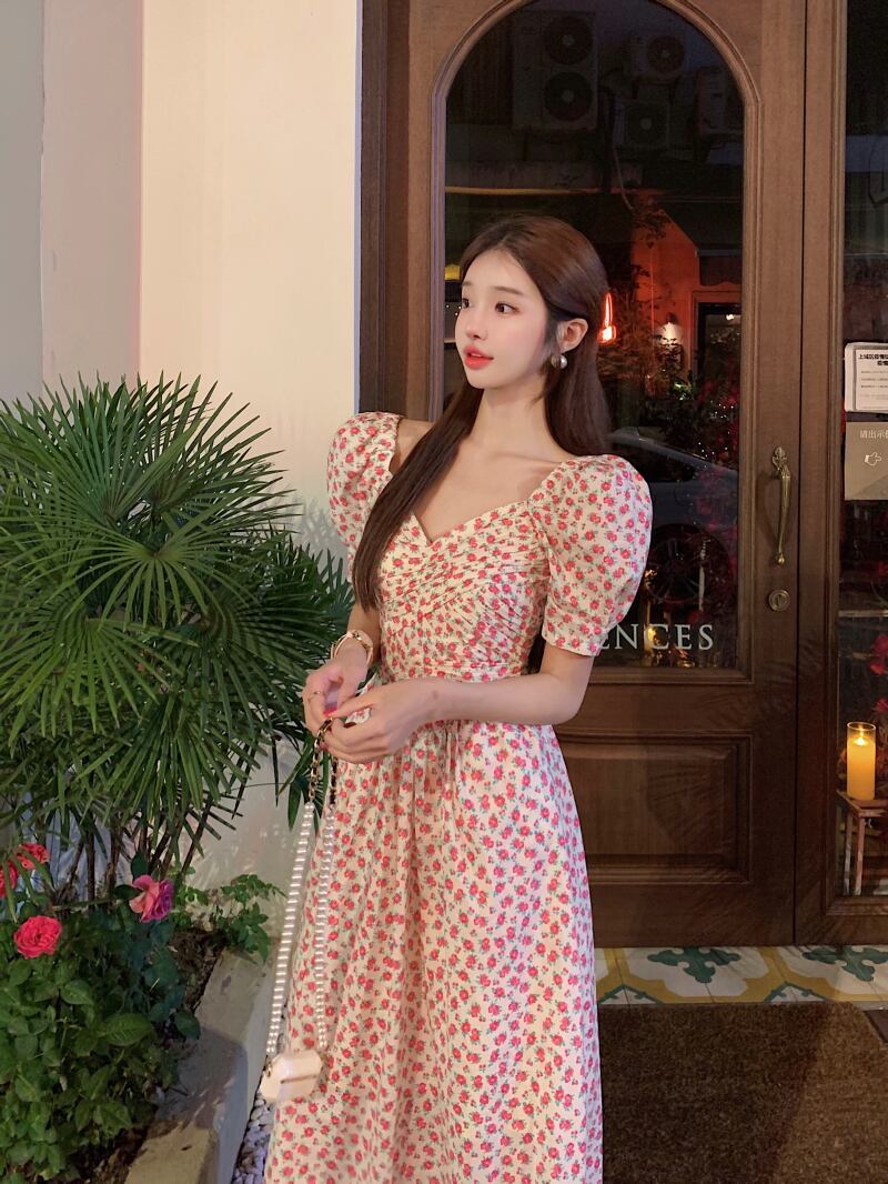 French gentle style tea break floral dress women's summer 2022 new v-neck waist slimming mid-length A-line skirt サマー 夏物 花柄 スカート Vネック Aライン 0921991334867347