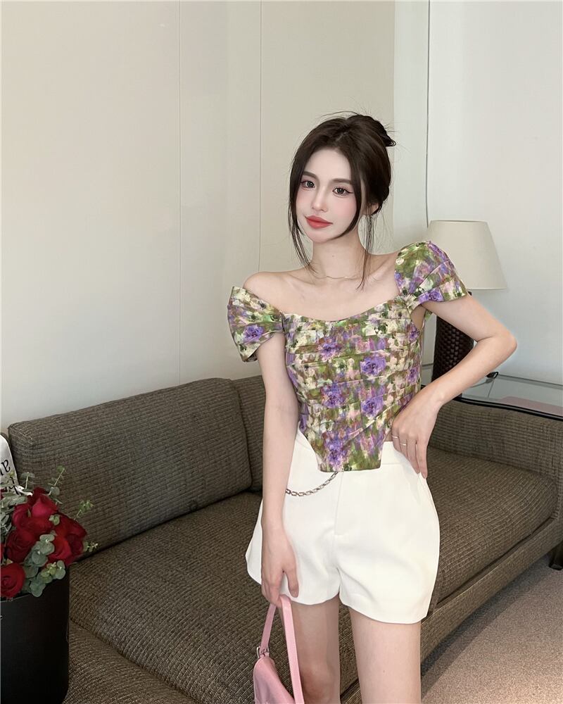French off-the-shoulder oil painting floral shirt women's summer 2022 new design niche pleated slim short top ショート プリーツ サマー 夏物 花柄 スリム 0921916551343534