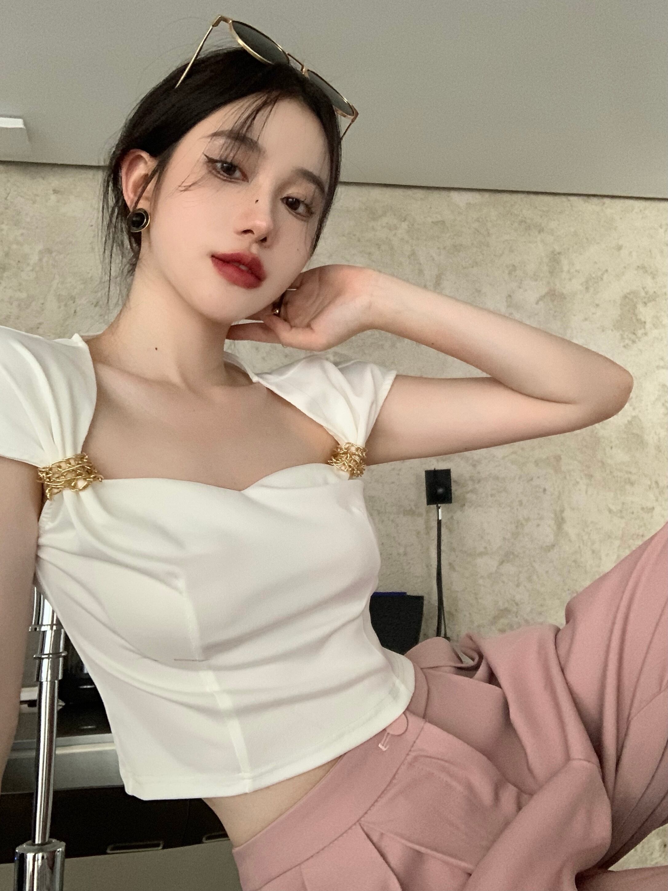 sense chain white short-sleeved t-shirt women's summer 2022 new French style slim slim short top ショート ホワイト サマー 夏物 スリム Tシャツ チェーン 0921923578664568