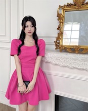 French rose red square neck dress women's summer 2022 new temperament chic pleated waist thin a-line skirt レッド プリーツ サマー 夏物 スカート Aライン スクウェア 092194846583051